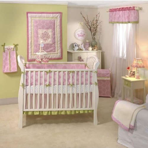 Piccadilly 4 Piece Bedding Set by Lambs & Ivy combines classic mix and match reinvented with regal details in pink and cream with a hint of green. Set includes Quilt, Bumper, Sheet and Dust Ruffle. The quilt has a satin center with a beautifully embroidered medallion. The back of the quilt is a lovely soft and comfy plush. Coordinates with Piccadilly bedding & accessories.